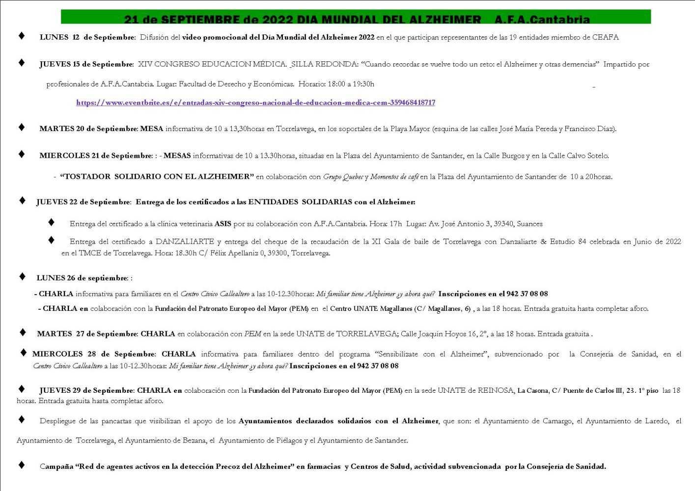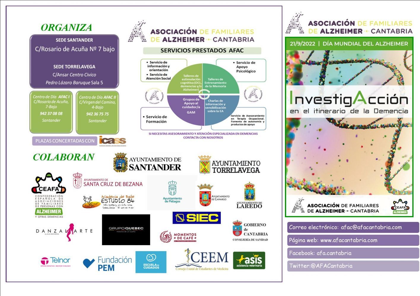 Este año el LEMA PROMOCIONAL DEL DÍA MUNDIAL DEL ALZHEIMER es “InvestigAcción. En el itinerario de la demencia”, con el que se trata de identificar qué tipo de investigación se corresponde con cada una de las fases de evolución del Alzheimer, así como los públicos objetivo a los que debe dirigirse y los objetivos esperados. Con este motivo la Confederación Española de Alzheimer (CEAFA) y AFACantabria van a plantear una serie